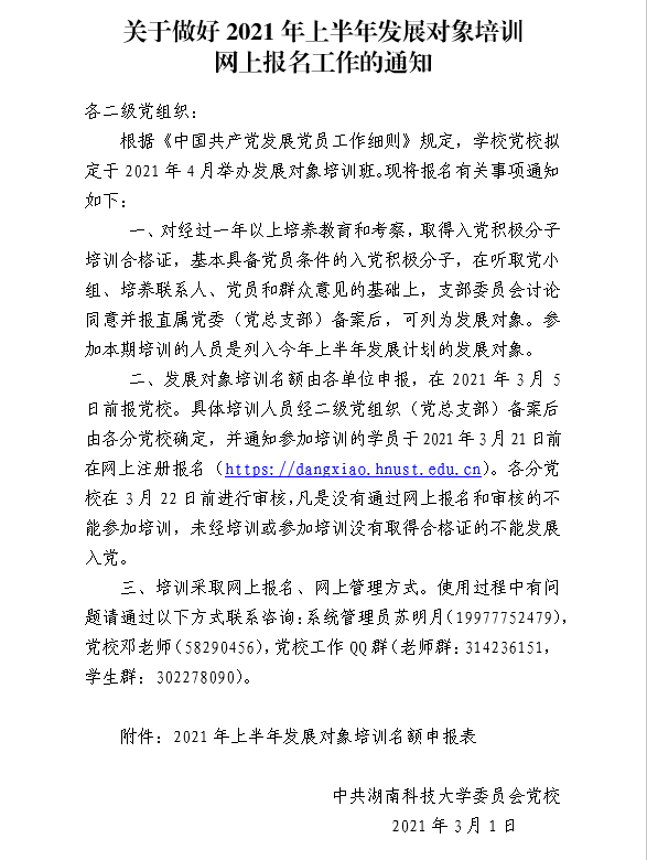 关于做好2021年上半年发展对象培训网上报名工作的通知