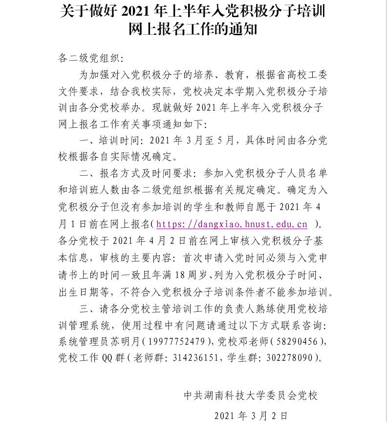 关于做好2021年上半年入党积极分子培训网上报名工作的通知