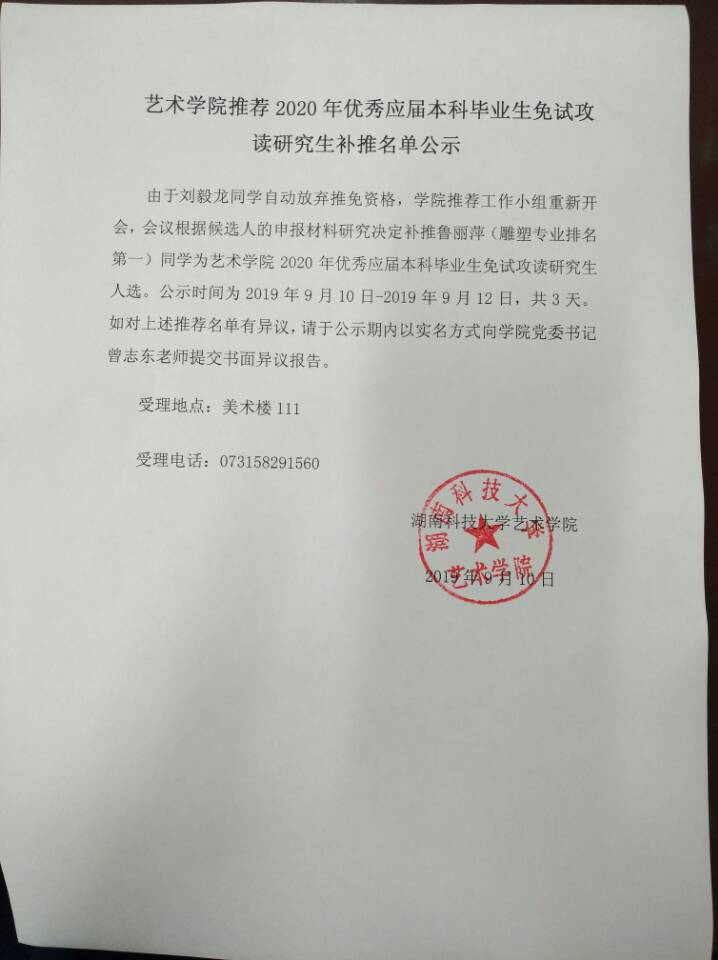 艺术学院推荐2020年优秀应届本科毕业生免试攻读研究生补推名单公示