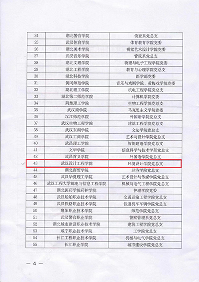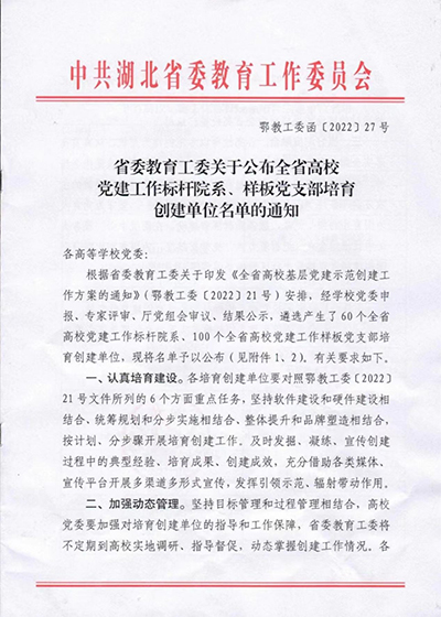 本网讯(通讯员 吴子慧)近日,湖北省委教育工委公布了全省高校党建工作标杆院系、样板党支部培育创建单位名单,best365环境设计学院党总支获评“全省高校党建工作标杆院系”培育创建单位。