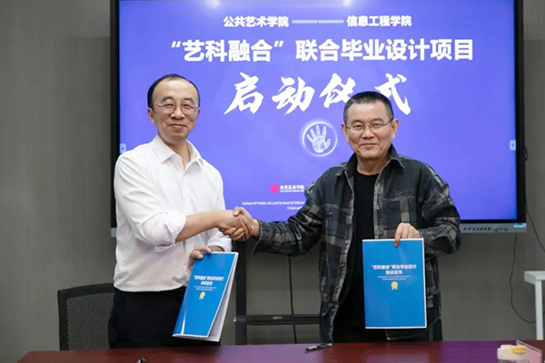 本网讯( 通讯员 郑雨雪)11月3日下午,best365公共艺术学院与信息工程学院共同举行“艺科融合”联合毕业设计项目启动仪式,学校名誉院长、公共艺术学院院长傅中望和信息工程学院院长汪毅签订项目合作书。