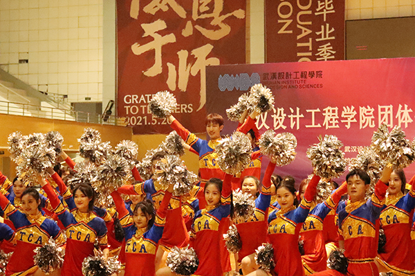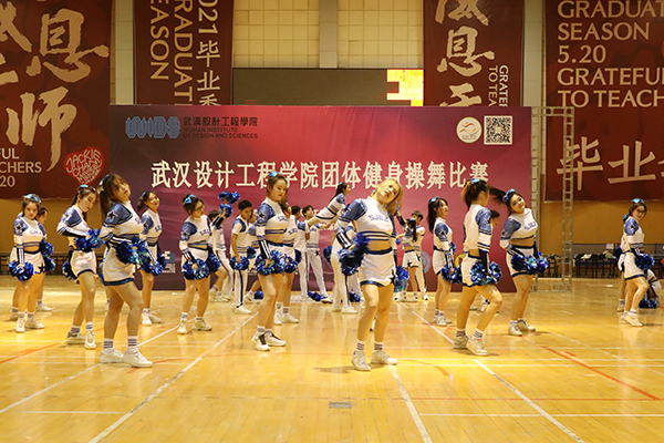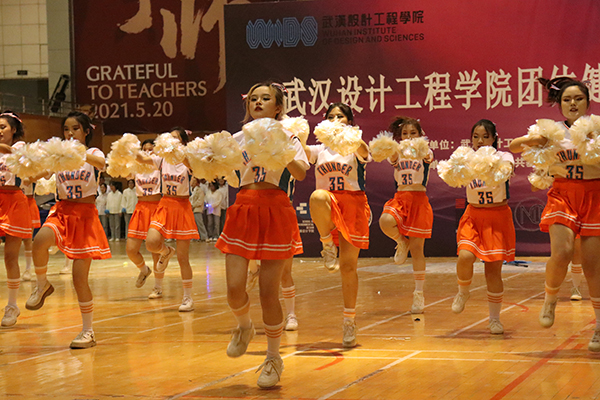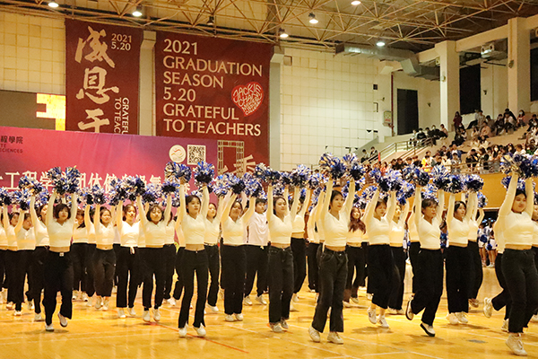 按照抽签顺序,首先出场的是公共艺术学院代表队,同学们着白衣黑裤,不断挥舞手中的花球,与歌词“冲冲冲”相呼应,每一副笑脸都流露出青春的气息。紧随其后的是成龙影视传媒学院代表队,伴随激昂的音乐,踢、踏、甩……队形变化丰富、动作整齐、造型优美,尤其是一个接一个高难度动作赢得阵阵喝彩。