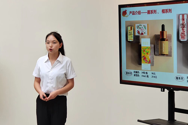 去年4月,学校教务处、校团委和大学生创新创业中心联合启动第七届“互联网+”大学生创新创业大赛校赛工作。张智老师向她介绍了赛事规则,分享了备赛经验,鼓励她积极参与。起初,万荣誉顾虑重重,后来,她鼓起勇气:“老师,我想和同学们组队参加比赛。”师生几人一合计,一项采用益生菌发酵技术开发石榴皮为化妆品原料的项目——“‘菌’‘榴’恋”就此诞生。万荣誉担任项目主讲人。
