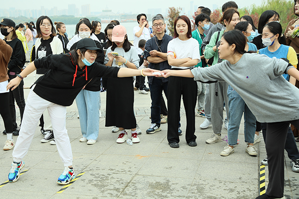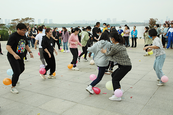 比赛当日,首先进行的是踩气球项目,每队派出10名老师,在双脚两侧各绑上一个气球,老师们既要保护好自己的气球不被其他人踩爆,也要想办法去踩爆别人的气球。比赛中,老师们你追我闪,你赶我返,身手敏捷,灵活躲避,加油声、尖叫声、“砰砰”声响彻广场。