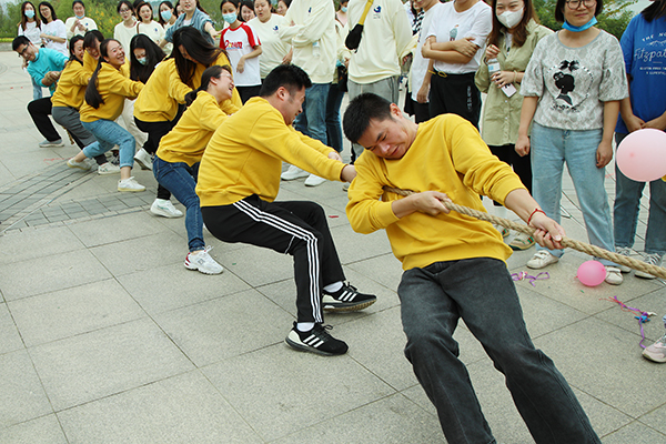 第三项赛事是备受瞩目的拔河比赛,十人一队进行车轮赛,每组比赛胜队进入下一轮比赛,决赛采用现场抽签对决方式进行。随着裁判一声令下,参赛队员们迅速进入状态,双手紧握长绳,压低身体,扎稳脚步,口中喊着“一二、一二”,铆足了劲儿齐齐用力,欢呼声和掌声把现场的气氛推向高潮。