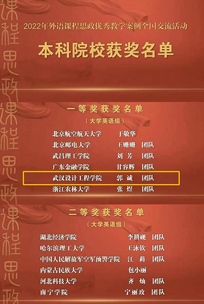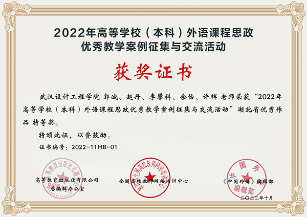 “2022年高等学校(本科)外语课程思政优秀教学案例全国交流活动”湖北省优秀作品特等奖获奖证书。