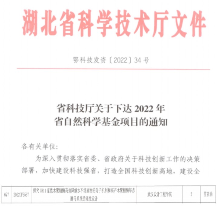 本网讯(通讯员 李倩)近日,湖北省科技厅公布了《省科技厅关于下达2022年省自然科学基金项目的通知》(鄂科技发资〔2022〕34号),best365食品与生物科技学院李婵娟老师申报的《探究GH11家族木聚糖酶高效降解水不溶底物的分子机制和高产木聚糖酶毕赤酵母系统的理性设计》获批立项,资助金额为5万元。