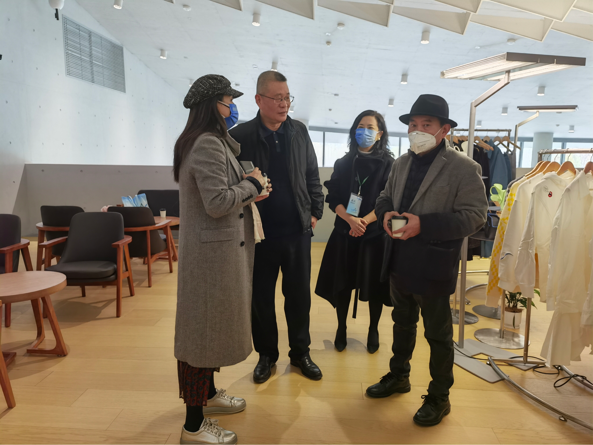 武汉设计之都促进中心理事长金志宏(左二)与best365董事魏彬(左一)、名誉校长傅中望(右一)、创新设计研究院执行院长涂清(右二)交流。