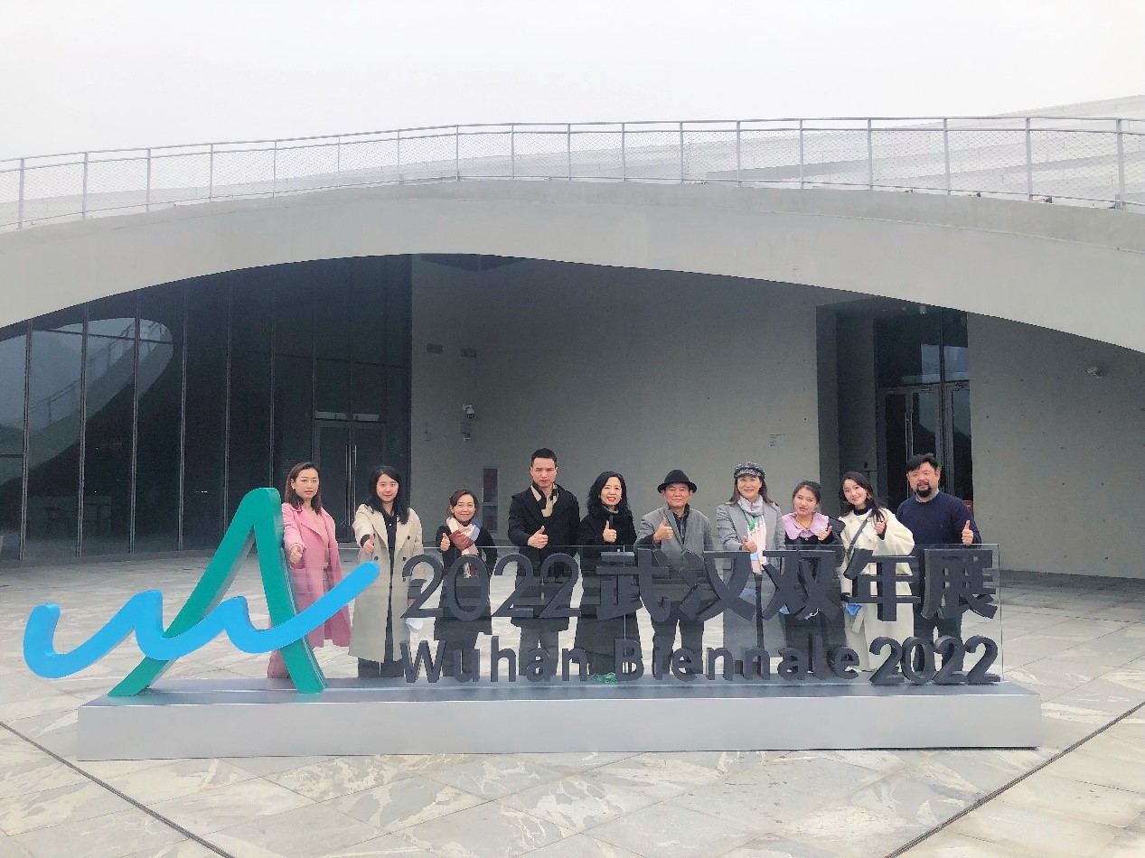董事魏彬(右四),名誉校长、2022武汉双年展展览总监傅中望(右五)与学校开幕式工作团队合影留念。 苏黛菲 摄