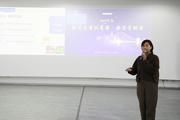 “2022年学院毕业生考研录取率占总人数25.5%。其中,食品质量与安全专业录取率达33.9%。”食品与生物科技学院付晓燕老师以优异的教学成效,向评委们展示了“强基础、重实践、求创新”的教学思路。她表示,除了注重专业课的教学质量外,自己还非常注重将社会主义核心价值观等思政元素引入到教育教学和学生能力培养之中,让专业课程也能起到培根铸魂、启智润心的效果。