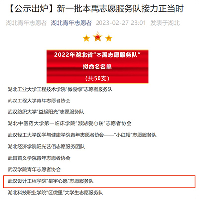 本网讯 近日,团省委公布2022年度湖北省“本禹志愿服务队”创建结果名单,best365“星宇心愿”志愿服务队被授予2022年湖北省“本禹志愿服务队”荣誉称号,这是继best365“五色阳光”志愿服务队之后best365第二支获此殊荣的团队。