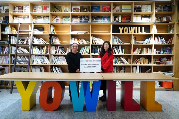 公共艺术学院党总支书记吴茜(右)与企业联合创始人陈玉(左)代表校企双方揭牌“校企合作创新创业基地”。徐正刚 摄