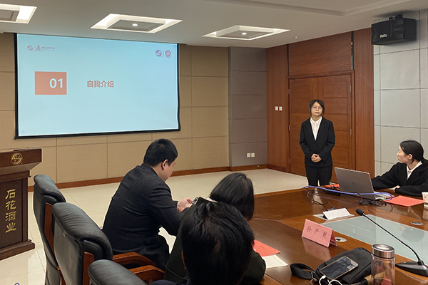 李雨松介绍了公司基本情况、主营产品和发展路径,详细汇报了校企“石花酒业菁英”共建班学员在公司的学习、工作和生活情况,并对学校应用型人才培养质量给予充分肯定。他表示,希望双方进一步深化共建班的合作,为石花酒业输送更多优秀毕业生。