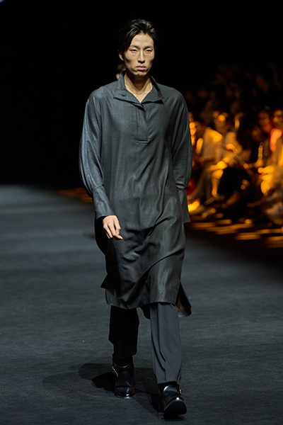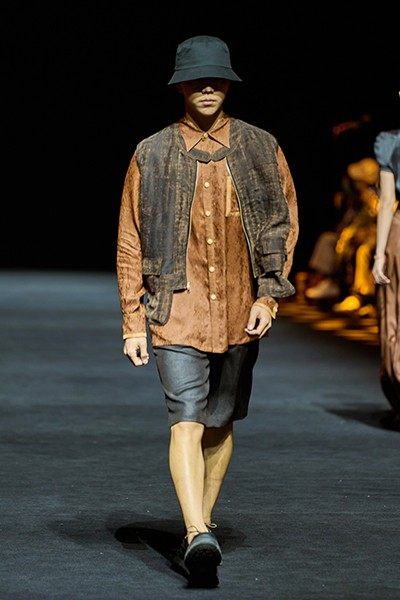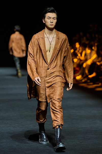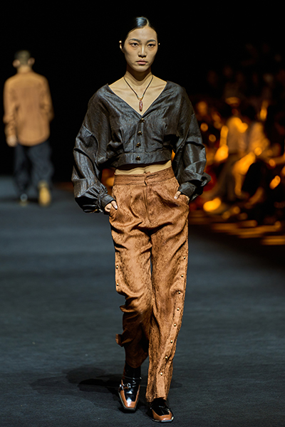 服装选用独具中国特色的香云纱为主要设计面料,并以香云纱传统的制作工艺和自然的精神内核为灵感,将全球时尚与中国人的衣着审美相结合,营造出得体、舒适、轻松、雅致的着衣风格,彰显出品牌“去符号,去繁复”的美学品位。