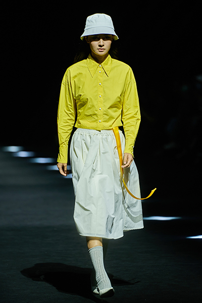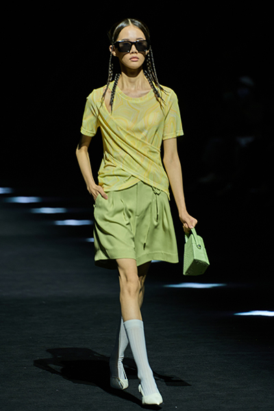 “将自然元素引入生活,在生活中找乐子。”设计师朱磊介绍,“印迹·2023”用通透纱质面料与特殊质感面料交互搭配,以亮白色、淡紫色、青葱绿的交叉设计构成本季服装的色彩基调,演绎出人与自然之间的亲密关系和穿着者不被当下束缚,自由自在、心无旁骛的纯真状态。