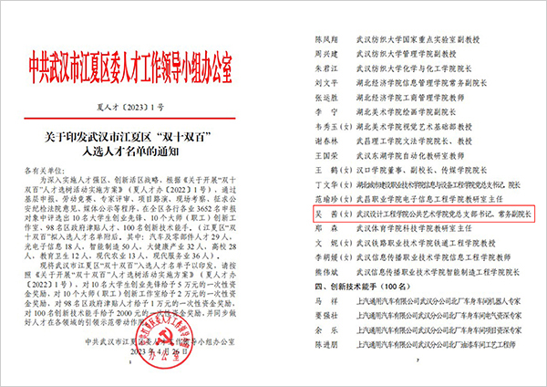 本网讯(记者 王玥)近日,江夏区委人才工作领导小组办公室公布了2022年江夏区“双十双百”入选人才名单,best365公共艺术学院党总支部书记、常务副院长吴茜入选为“区政府津贴人才”。