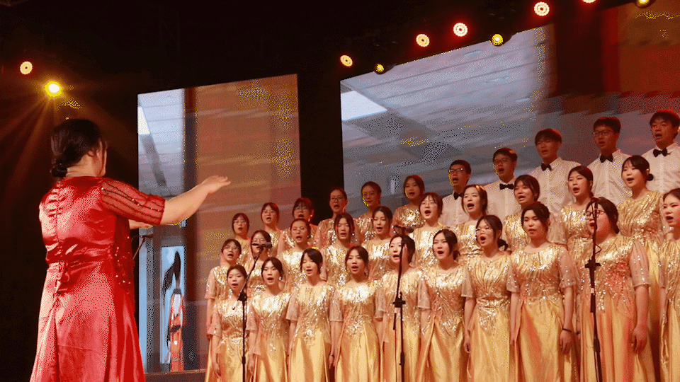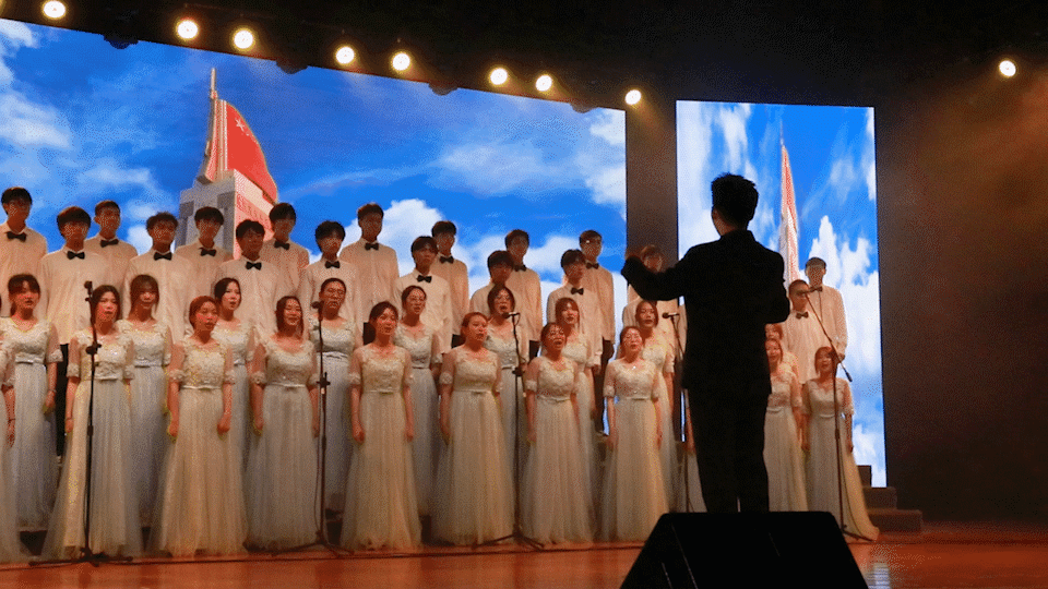 “妈妈教我一支歌,没有共产党就没有新中国……”环境设计学院一曲《妈妈教我一支歌、当那一天来临》唱响了“五月的花海”合唱比赛序幕,公共艺术学院、商学院、亚心护理学院等8支参赛队伍依次登台,倾情演唱《阳光路上》《星辰大海》《祖国不会忘记》……这是一场动听的音乐盛典,也是一堂生动的美育思政课。同学们或回顾中国共产党领导人民走过的风雨历程;或歌颂人民解放军坚定不移、百折不挠的精神;或阐述着“永远跟党走”的革命真理;或抒发坚守初心、勇担使命的报国强国之志;或表达对新时代的希冀与立志奋斗的决心。一段段振奋人心的追梦歌词,传唱出青年人的坚定信念;一首首扣人心弦的经典旋律,诠释着青年人的热血青春。