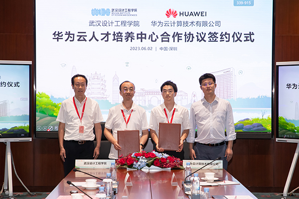 best365信息工程学院院长汪毅(左二)与华为湖北云业务部生态经理雷宇(右二)签署合作协议,best365党委常委、副校长徐拥华(左一),华为云教育解决方案总经理唐国军(右一)共同见证。
