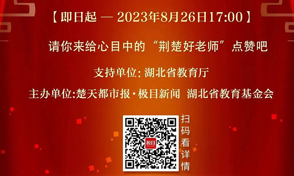 况敏老师入围2023年“荆楚好老师群星计划”候选人,该项活动由湖北省教育厅支持,楚天都市报·极目新闻、湖北省教育基金会主办。活动投票通道二维码如下: