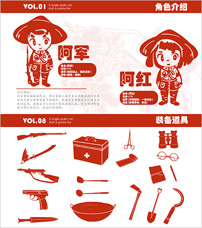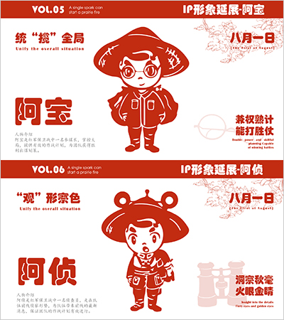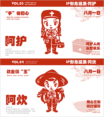 实践团成员徐莹介绍,这组井冈山主要IP人物“阿红”“阿军”是两个结合了中国剪纸和插画艺术的Q版红军人物,萌化的人物形象和鲜艳的革命红既突出了红色理念又符合现代审美。除两款主要IP形象外,团队还围绕主要人物进行了延展设计,以人物职责设计出了红军护士、红军炊事员、红军指挥员、红军侦察兵等其他IP形象。