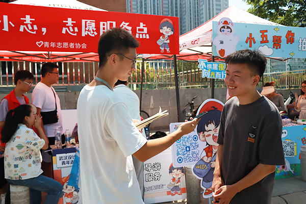 大学生通讯社记者采访第一次来武汉的新同学。易雨竹 摄