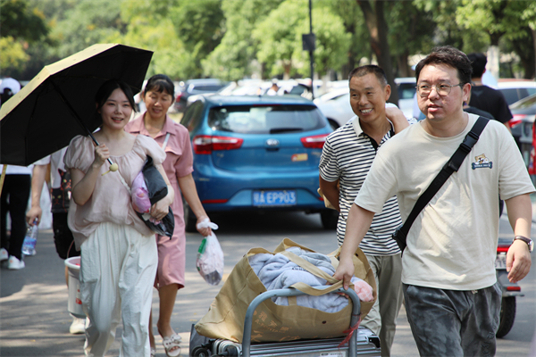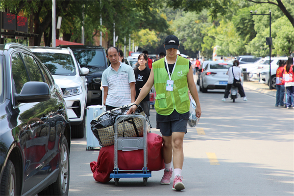 商学院2022级学生柯政是本次迎新志愿者的一员。他介绍说,一周前志愿服务队就已经做好了各项迎新准备工作,队员们也都经过了严格的培训,确保迎新工作万无一失。“记得去年我还是名新生的时候,看到学长学姐们帮助我搬行李、办手续,我深受感动。那种温暖和关爱一直留在我的脑海里。因此,得知这次迎新工作后,我毫不犹疑地报名成为一名志愿者。”他在采访中祝愿新同学,“‘新’装上阵,学有所成。”