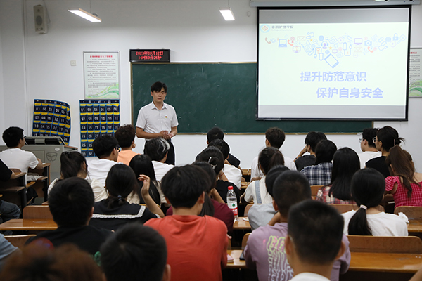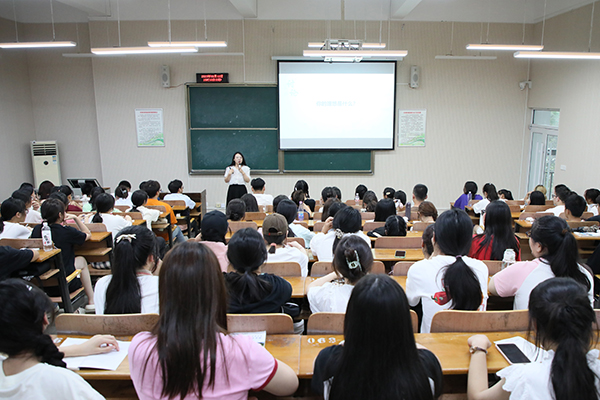 同一时间,心理健康中心吕睿莹老师在和光1019报告厅为时尚设计学院新生开展心理健康教育,吕睿莹从大学生活的“适应”与 “发展”两方面,引导学生关注自身心理健康状态,掌握情绪调节基本方法,并向同学们介绍了心理咨询服务的渠道。“这堂课很好地缓解了我刚入学的紧张和焦虑,对于适应大学生活很有帮助”。亚心护理学院孟祥宇老师则结合学院自身特色、运用生动的案例,向同学们进行传染病防控教育和防诈骗安全教育。