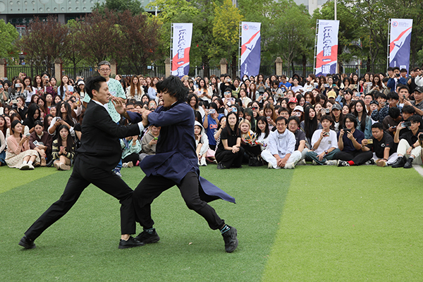 成龙院长饶有兴致地观看武术队醉拳表演。林耘至 摄