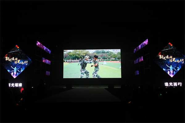晚会播放新生军训回顾视频暖场。刘恒 摄