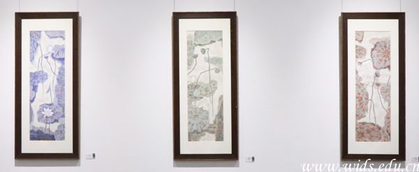“水”、“火”、“土”以三种不同的独特艺术表现形式,给大家带来了丰富的视觉盛宴。“水”,水彩,方圆教授以水和彩的交融与挥洒,渲染与点缀,表达了她冰下激流内在情感的萌动,和不墨守成规的大胆探索。“火”,高温釉下彩的窑变,管家庆教授将釉与火结合,通过一千二百度的高温,追求破茧为蝶的幻化色彩魅力。“土”以矿物质颜色的混响效果,追求画面的丰富多彩或深沉内敛。沈松德教授习惯用矿物质颜色反复重置与并置,以严谨细腻的表现语言,一点一点,一笔一笔,达到了一个充满虚无禅静的出世境界。