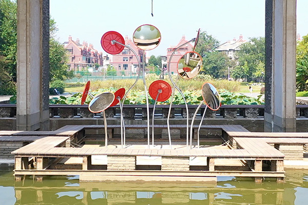 “荷叶代表自然界的美,凸面镜代表人类的创造力和科技之美。”《荷韵镜池》作者湖北美术学院刘洋将代表人类与自然的表现符号有机融合,蕴含人与自然之间丰富的生态伦理内涵。视觉上,作品通过凸面镜对荷塘景色的反射扭曲,引发了观者的好奇心和思考力。“池中有镜,镜中有人,作品周围的环境和观众之间因为作品而持续发生着丰富的互动。”