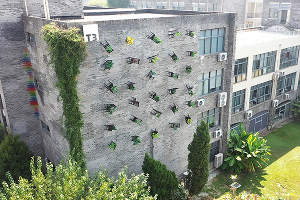 将学生的旧椅子插上小树苗,沿着墙面悬挂,形成了一个以墙为地,以天为顶的高空课堂。“学校是教书育人的场所,我把树苗比作莘莘学子,每把椅子上都有学子学习过的痕迹,这也是椅子的使命与记忆。”作品《课堂》的作者、公共艺术学院教师汪甜说,“椅子朝向各个不同的方向自然悬挂,象征着学子们即将踏入社会,启航各不相同的精彩人生。”