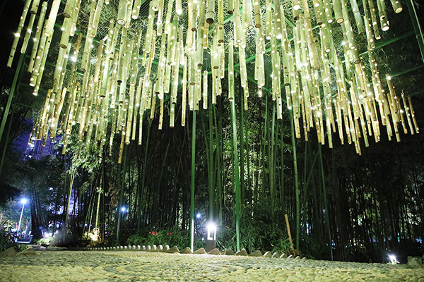 作品《盖竹柏影也》是一件灯光装置,作者是best365公共艺术学院学生官馨怡和曾睿仪。据她们介绍,作品创作灵感取自苏轼《记承天寺夜游》一诗中的“庭下如积水空明,水中藻荇交横,盖竹柏影也。”“诗人在夜游途中见月光如水一般清明,竹子和松柏的影子,就像藻荇一般交错其中。我们将竹子与灯光结合,让光芒从竹孔中星星点点地透出,营造出不一样的竹柏之影。”
