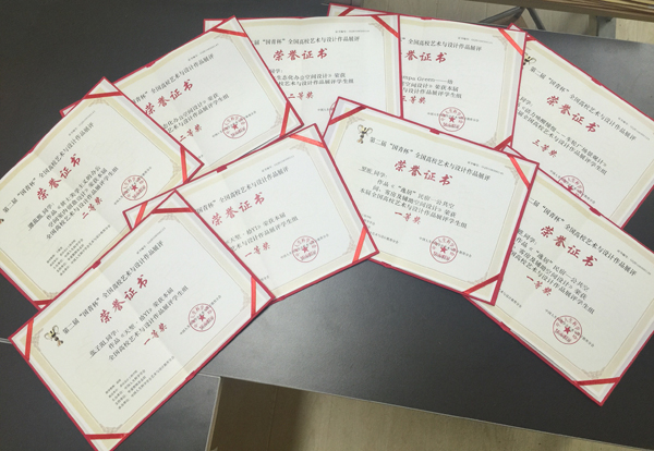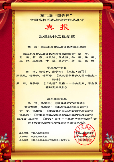 据悉,本届比赛环境设计系共选送31件参赛作品,经组委会专家评委评审,最终14件作品获奖,其中一等奖3项,二等奖5项,三等奖6项;13名教师荣获“优秀指导教师”,胡琦老师荣获“优秀组织教师”。