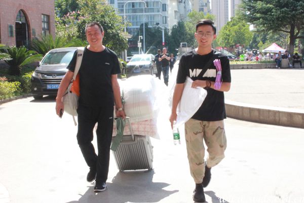 新生和家长一脸喜悦地拎着行李来报到。张意含 摄