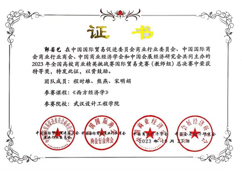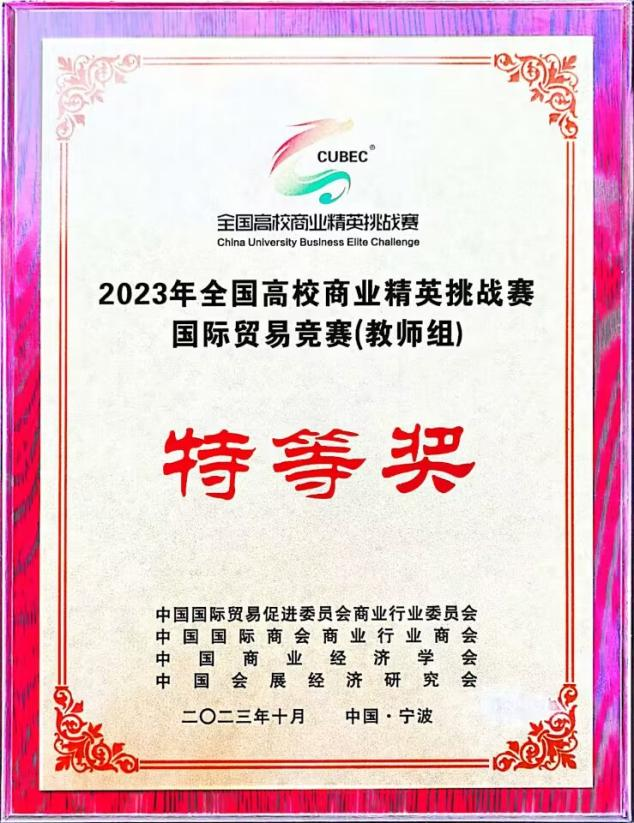商学院教师团队喜获2023年全国高校商业精英挑战赛国际贸易竞赛(教师组)特等奖。