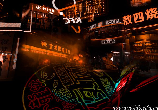 作品《城市之形》便是这样一组代表,它将江汉路和光谷步行街的夜景进行重构,用巨人视角再现繁华热闹的武汉。戴上VR眼镜,熟悉武汉的观众能一眼分辨出江汉路“周黑鸭”“鲍师傅”“大汉口城”“麦当劳”等具有视觉代表的霓虹灯及高层建筑,它们都以与观众等高的形式呈现。随着观众走动或旋转身体,眼镜中呈现的光影和建筑也随之千变万化。