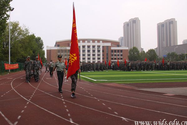 早上7点整,军训旅各连队方阵就已在操场集合完毕,整装待发。队列的红旗在秋风中上下翻飞,同学们个个身姿挺拔,精神抖擞。随着旅长王文胜一声令下,队列分为两列纵队,整齐有序的从校门口出发。