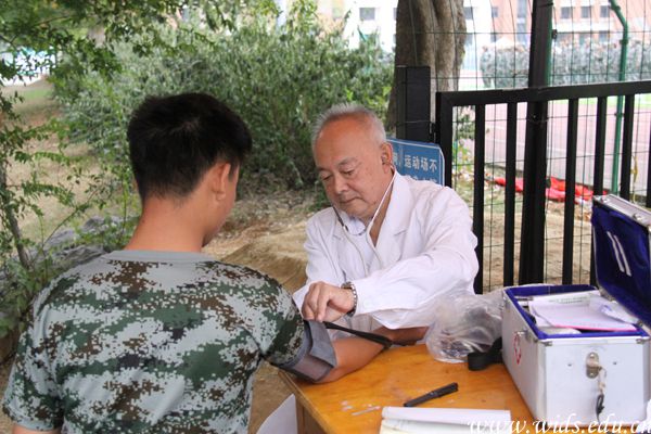 足球场边,校医院的值班医生随身携带者医药箱全天值守,一旦有学生不适需要诊治即立刻进行治疗和处理。据校医院的夏医生介绍,今年军训期间天气十分炎热,“秋老虎”的威力很大,往年军训最高温仅在32℃,而今年连续多天最高气温达到35℃,且潮湿闷热,对学生们是很大的考验。据统计,校医院每天接诊新生人数在110人左右,多为中暑、晒伤和感冒发烧病人,校医院为此将原定于晚上八点的下班时间推迟至九点甚至更晚,便于新生能及时就诊、减缓病痛。