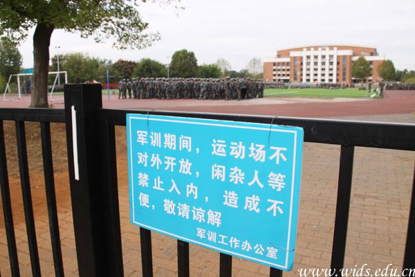 军训工作办公室为军训场地设置的提示牌。刘恒 摄