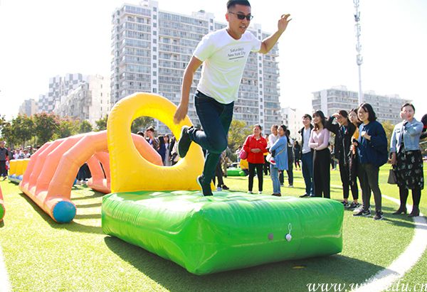 上午9点半,教职工趣味运动会在足球场上正式开帷幕。首先进行的是翻山越岭比赛,每队成员需要依次穿过平衡木、跨栏、钻网、鱼跃龙门等四个障碍物,比赛以接力赛形式展开,用时最少的队伍获胜。赛场上,年轻的教师们铆足干劲,迈开大长腿向终点进军。赛场边加油声此起彼伏,场面热闹非凡。