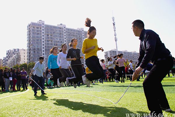 在去年的教职工运动会上,集体跳绳项目广受好评,今年继续沿用这一项目。参赛的12支队伍6人一组,1分钟内累计跳跃次数最多的队伍获胜。记者观察发现,臂力强大的男老师们多承担甩绳的职责,轻巧活泼的女老师则负责跳绳,各小组配合默契,难分伯仲。