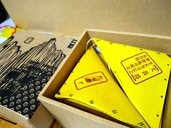 他将茶包包装设计成黄色“符咒”,每张“符咒”取不同名称,如“文昌符”“健康符”“事业符”等,对应不同愿望。符咒被折叠成三角形,喝茶人每拆开一步就会获得一个动作提示,如深呼吸、伸展、龟吸静心等,最后才得到茶包。“这是一个交互设计,目的是让用户品茶前能放松心情,内心宁静。”陈伟鹏介绍说。