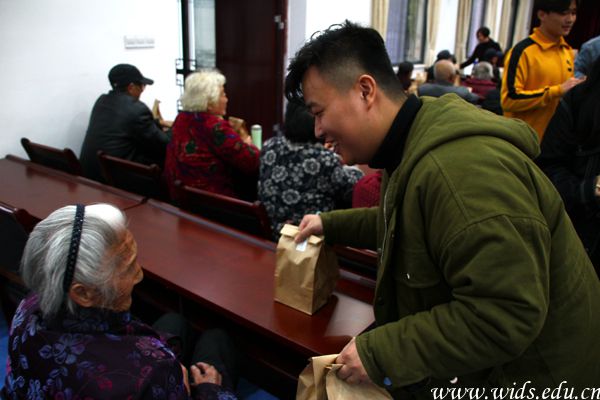 10日下午,记者在福利院娱乐室看到,学生们将精心分装成礼品包的150袋食品一一送到老人手里,老人们高兴的接过学生的礼物,脸上的笑容溢于言表。与此同时,大圣戏剧工作室的成员们还拿出他们的看家本领——唱歌、跳舞、武术表演、相声小品,他们用信手拈来的才艺表演为老人们献上了一台爱心演出。