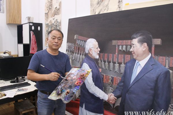 据了解,2018年4 月27日,习近平在武汉会见来华进行非正式会晤的印度总理莫迪,并共同参观湖北省博物馆精品文物展。欧阳德彪的绘画主题正是取材于此。“湖北有深厚的历史文化底蕴,在现在文明中反映楚文化的基点,这一主题不仅能展现近代科技发展与古代文化的传承与递进,更能体现时代特色,反映湖北改革开放的状态。”欧阳德彪介绍,油画采用现实主义创作方式,还原两国领导人会晤时严肃、真实又不失亲切感的场面。编钟的青铜质感、漆器图案、造型配饰等均以实物为标准绘制。