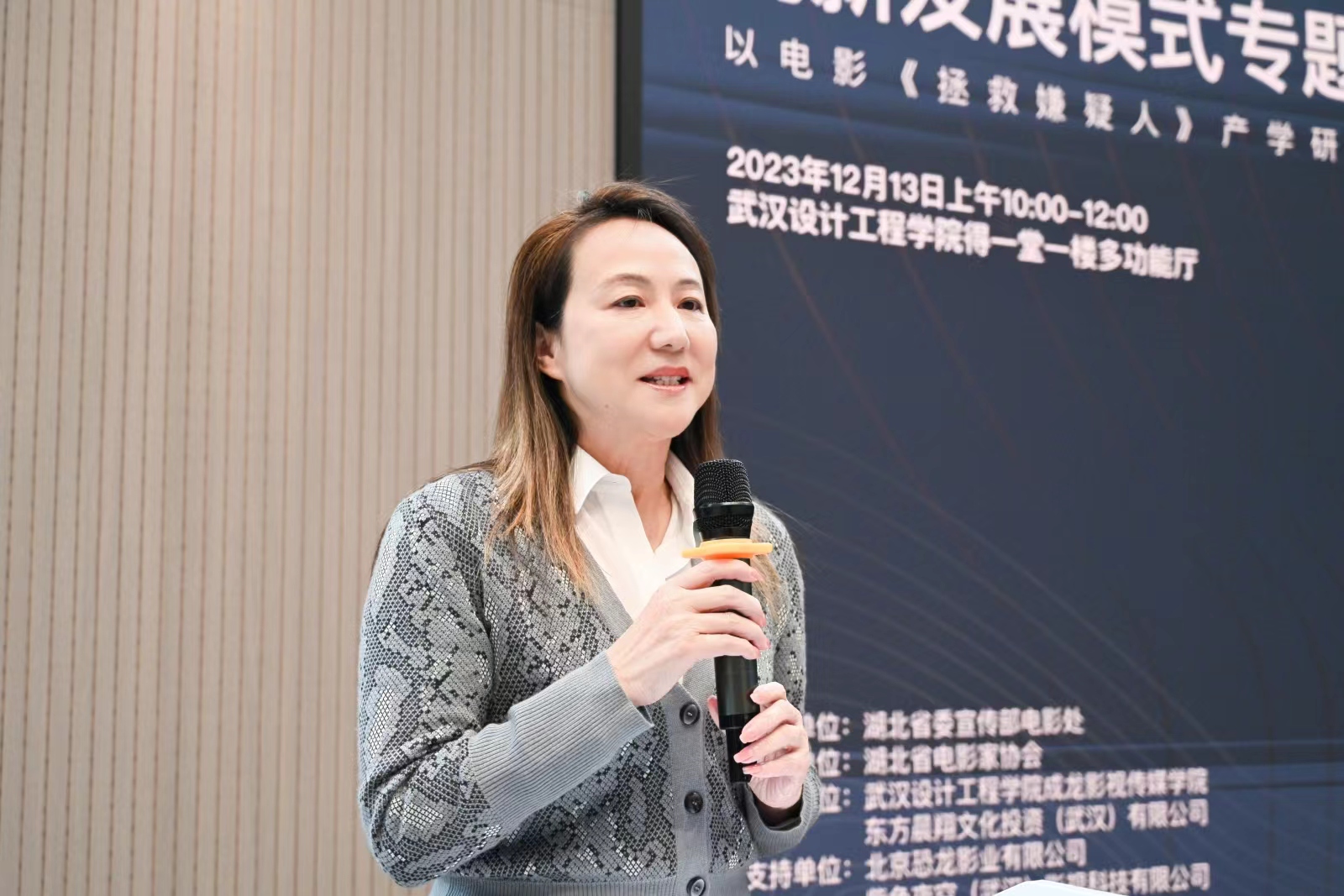 《拯救嫌疑人》出品人、总监制,北京恐龙影业创始人、CEO孙嵘介绍该片的策划理念、筹备制作和市场推广等方面的经验。她表示,影片当前的高票房成绩,离不开湖北省电影工作者和成龙影视传媒学院师生的鼎力支持,它不仅是鄂产电影的一次成功实践,更开创了产学研深度融合推动影视行业持续健康发展新模式。