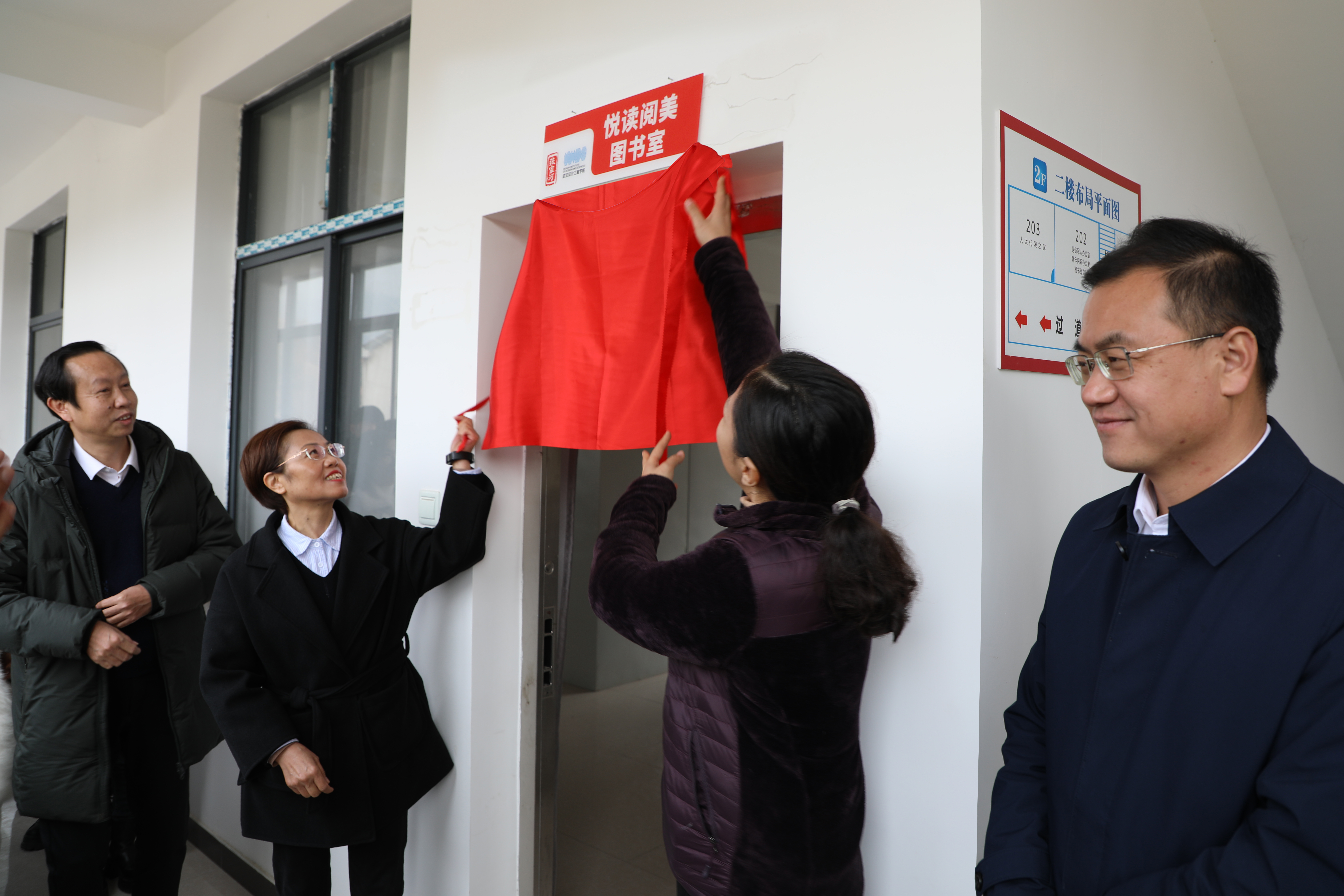 学校党委书记冉春桃、罗田县副县长桂雁鸿共同为“悦读阅美”图书室成立揭牌。