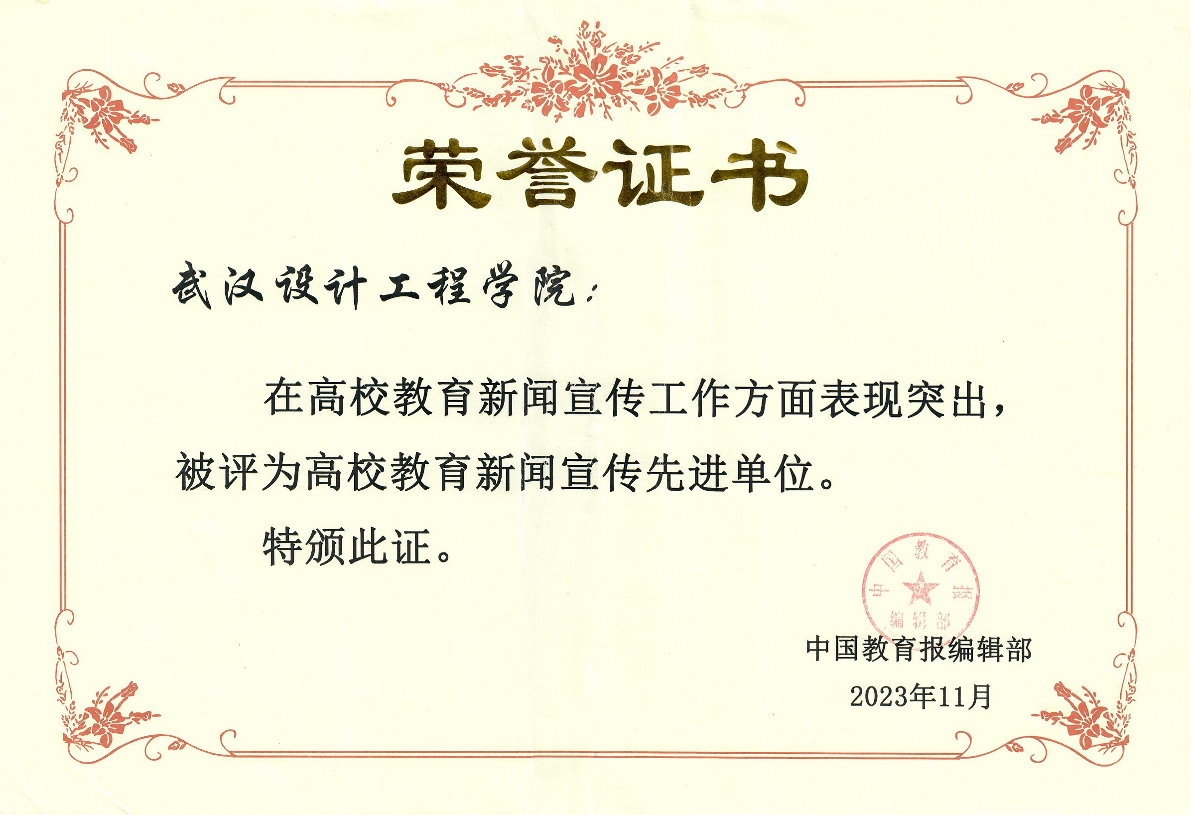 “高校教育新闻宣传先进单位”荣誉证书。