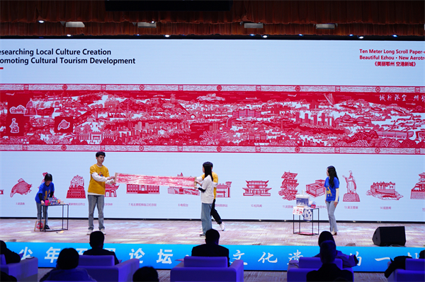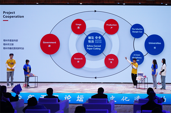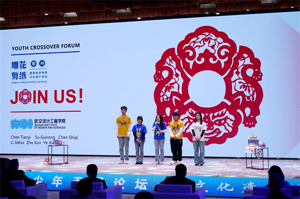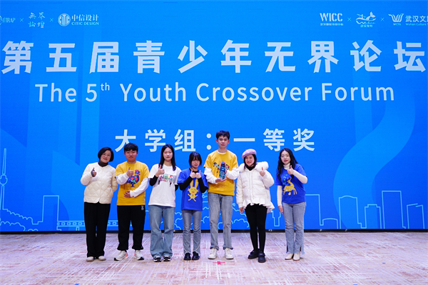 本网讯(通讯员 李嘉慧)1月6日下午,第五届青少年无界论坛在武汉国际传播中心举行。由国际交流处牵头,联合公共艺术学院、商学院、成龙影视传媒学院组建的跨专业学生团队,以“‘纸剪’上的非遗——鄂州雕花剪纸文创之路”为题与国际专家现场对话,一举斩获大学组一等奖。