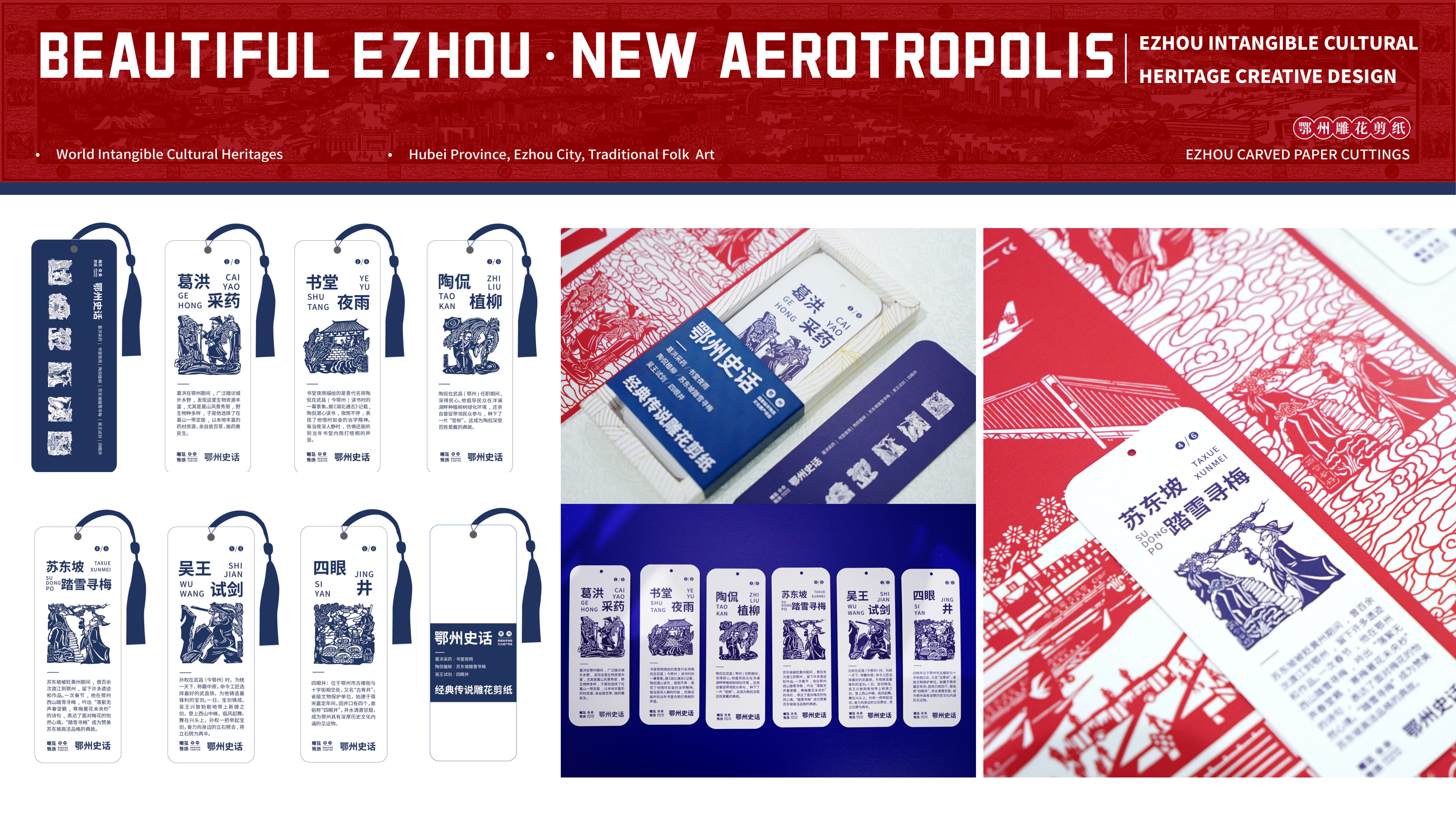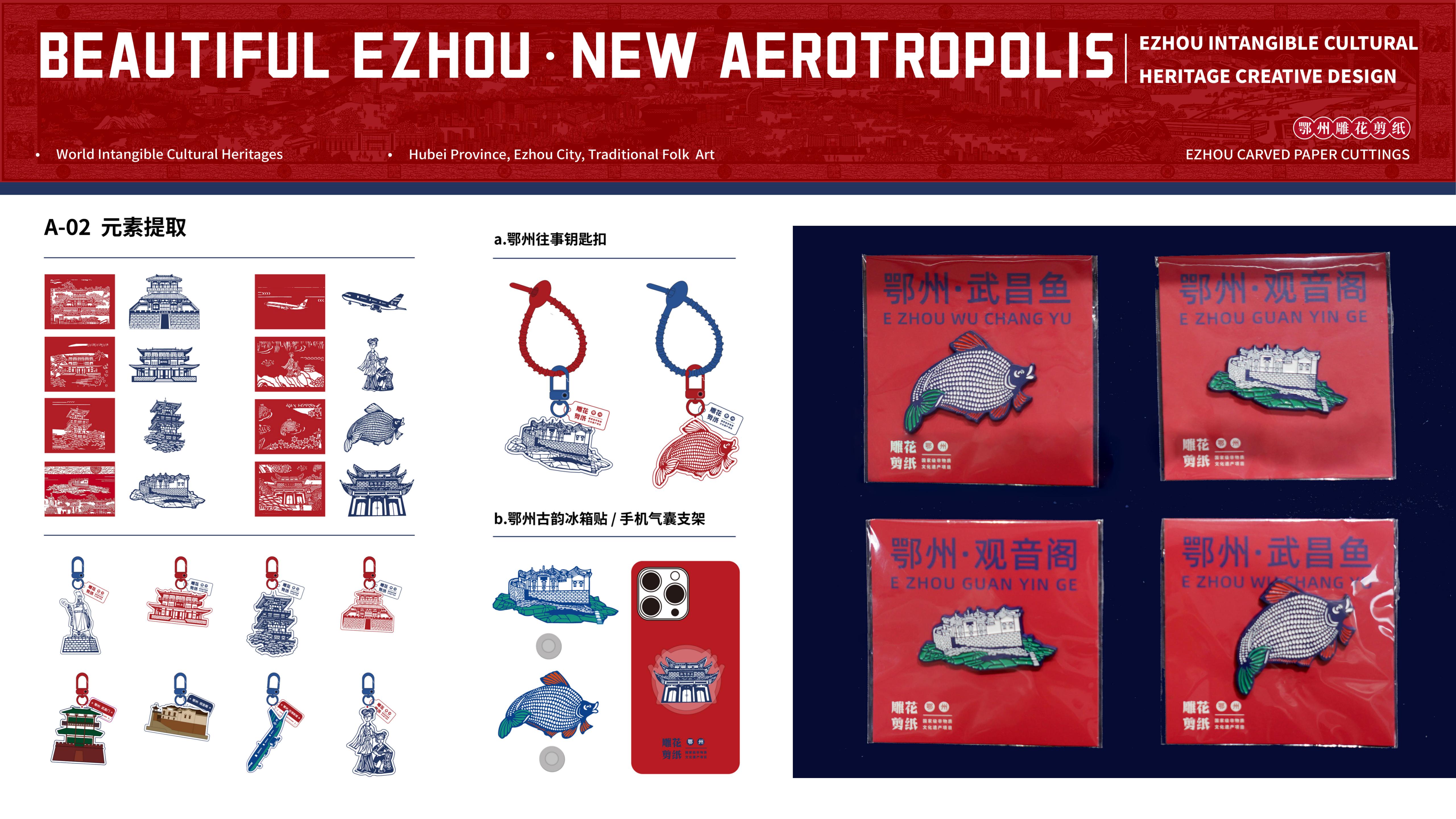 “鄂州雕花剪纸历史悠久,是国家级非物质文化遗产项目。学生们以‘非遗+’为创意核心,从‘非遗+文旅创研’‘非遗+数字创新’‘非遗+多元展赛’三个方面探索非遗传承新意,以年轻人的视角助力非遗跨文化传播。”指导老师王纯、黄书君介绍,团队充分利用数字技术让雕花剪纸‘活’起来,通过提取《美丽鄂州·空港新城》中武昌鱼、观音阁等代表性元素进行二次创作,设计出精美的鄂州往事钥匙扣、鄂州古韵冰箱贴、鄂州史话书签等人们日常可用的文创产品,让非遗文化不仅好看、好玩,还能融入市民生活。